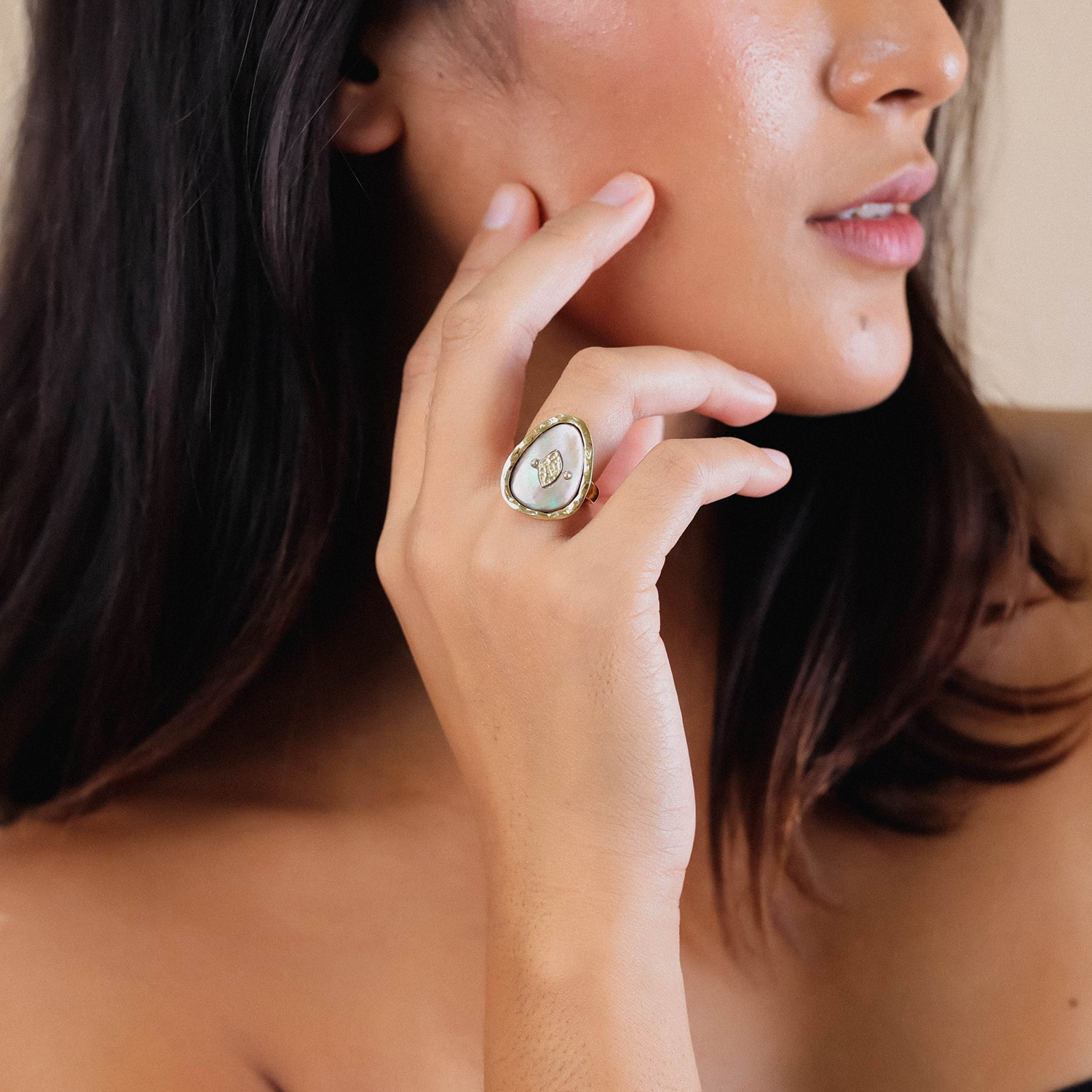 Une ligne de bijoux en nacre brune, incrustés de strass et d'éléments dorés, associés au jaspe brique, pour une allure lumineuse et chaleureuse !