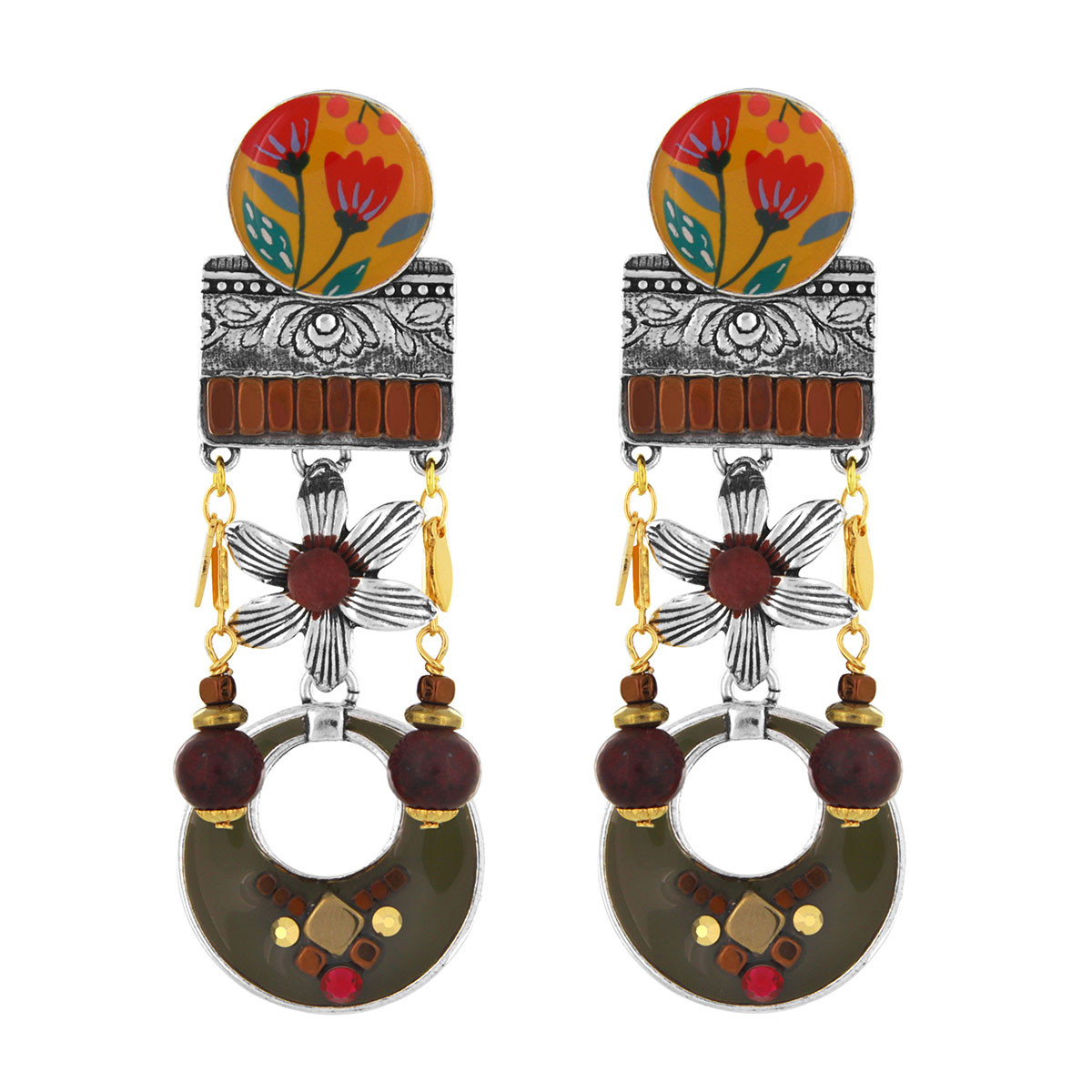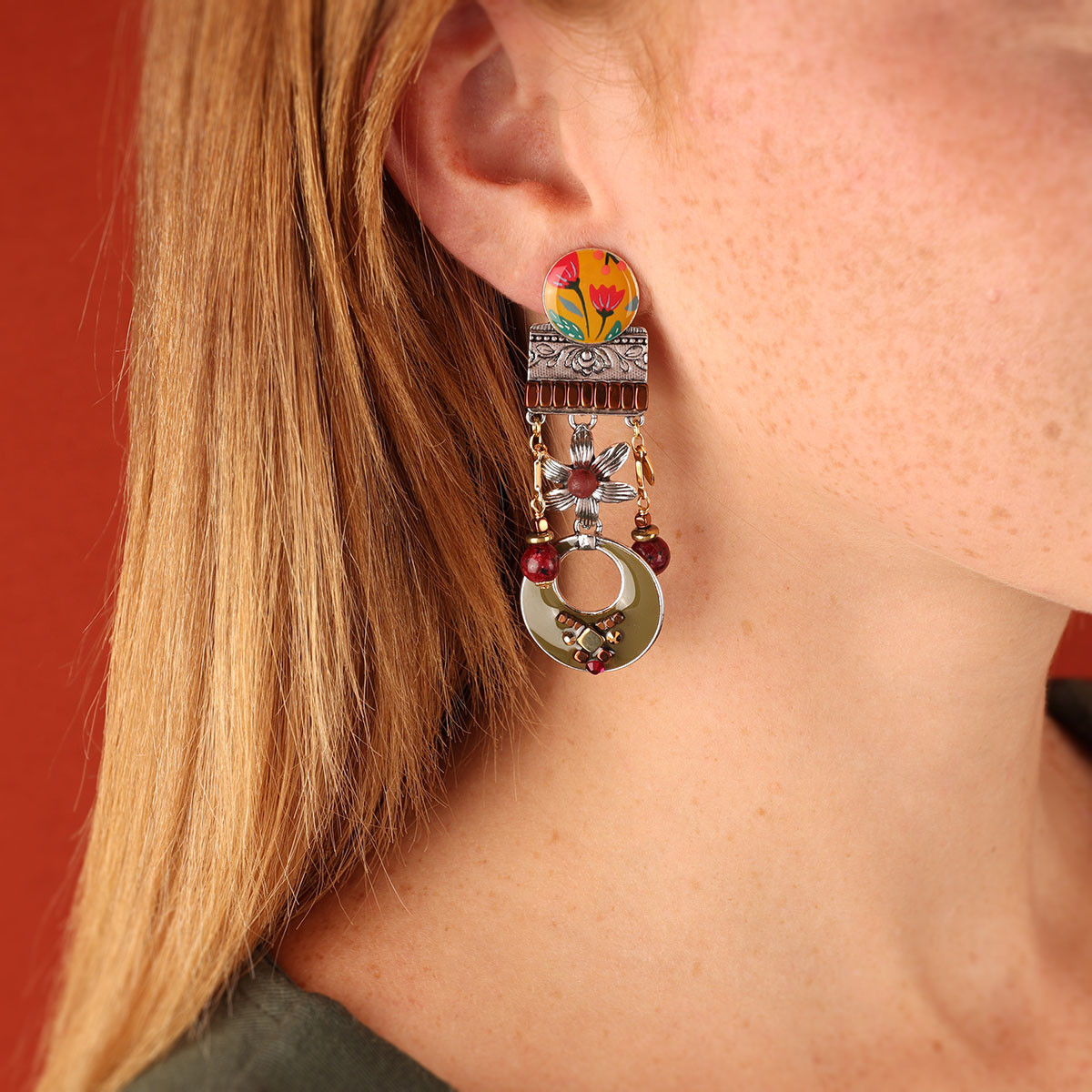 Composition de la ligne : Résines colorées dont les motifs sont peints à la main, Perles en verre, Strass, Agate, Métal sans nickel et traité contre les allergies.