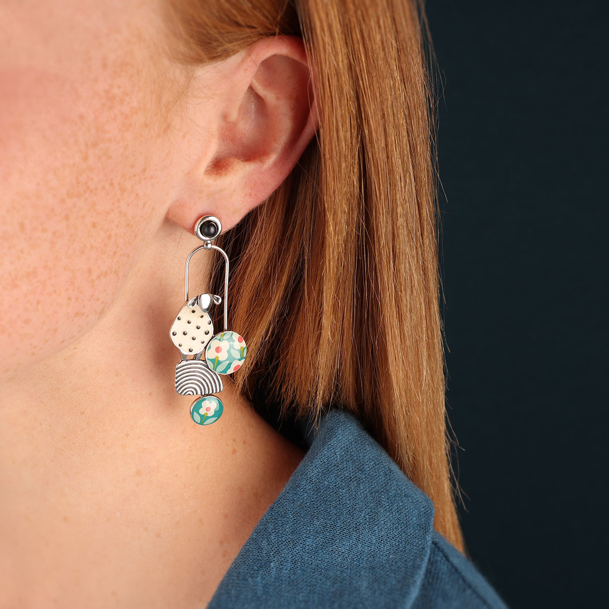 Composition : Résines colorées dont les motifs sont peints à la main, Hématite teintée, Métal sans nickel et traité contre les allergies.