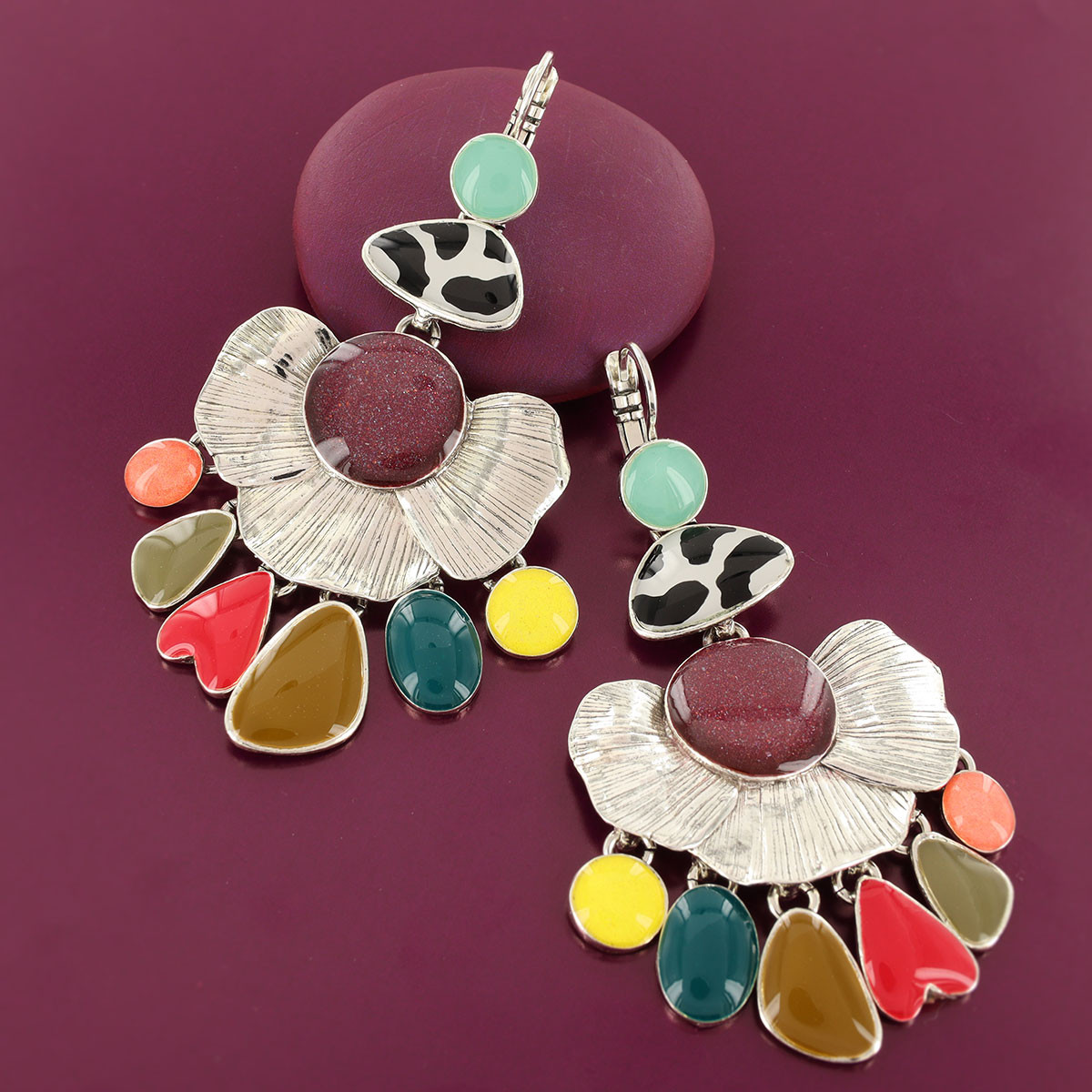 Composition : Résines colorées dont les motifs sont peints à la main, Poudre de Mica, Métal sans nickel et traité contre les allergies.