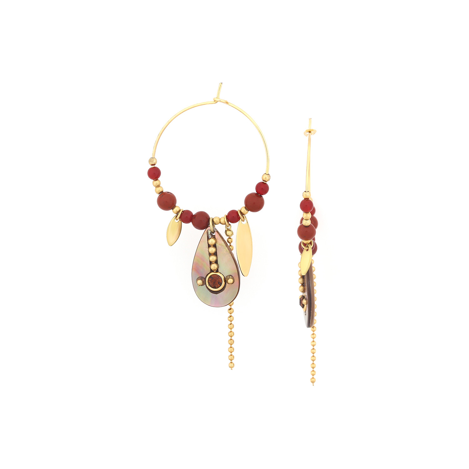 Composition de la ligne : Agate rouge, Nacre brune, Jaspe rouge, Laiton doré à l’or 18K sans nickel et traité contre les allergies.