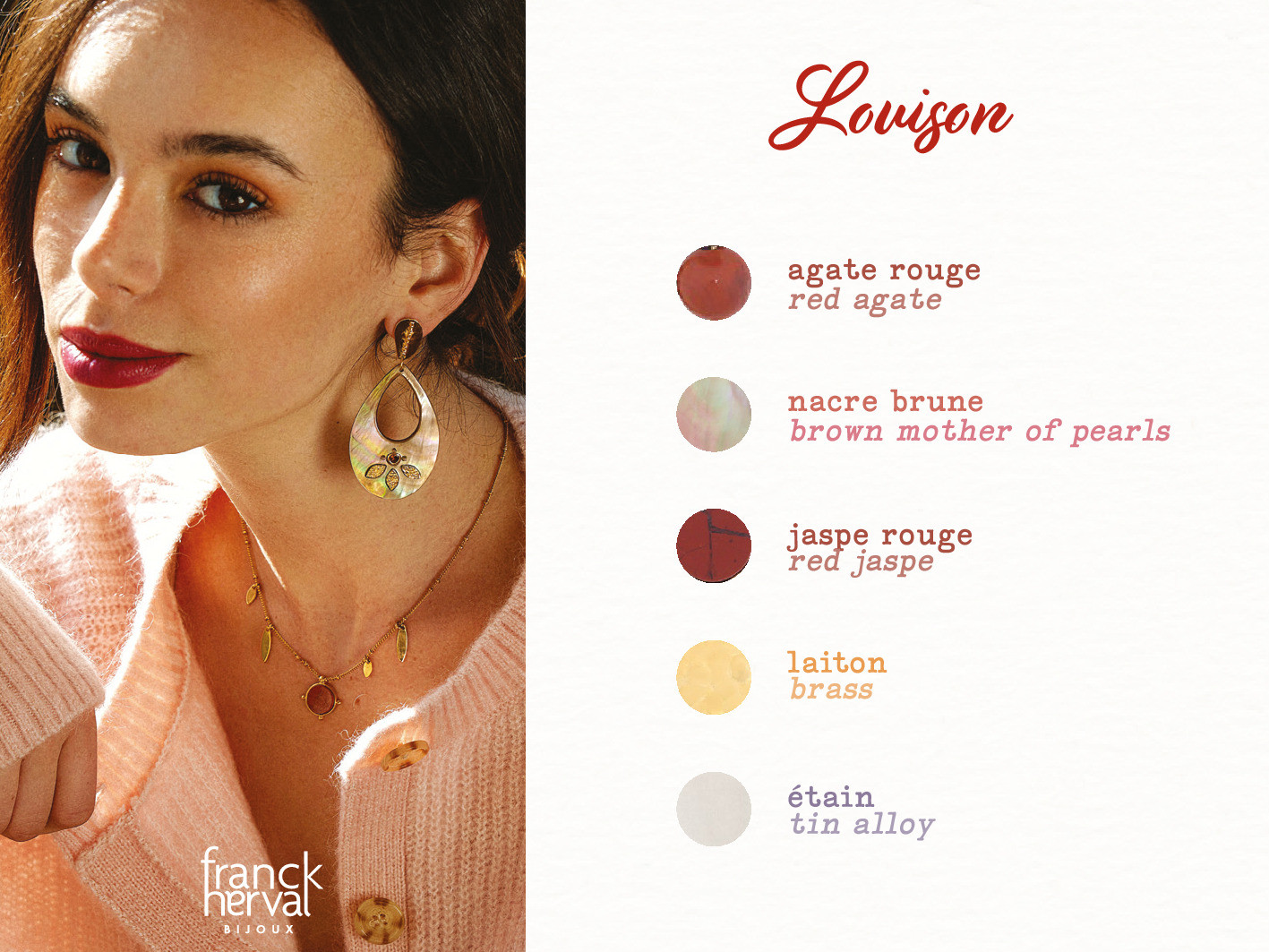 Composition de la ligne : Agate rouge, Nacre brune, Jaspe rouge, Laiton doré à l’or 18K sans nickel et traité contre les allergies.