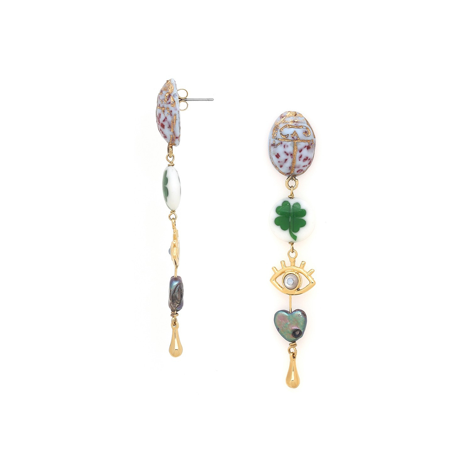 Composition : Émail, Étain, Nacre De Palawan, Perle De Verre, Perles De Culture, Swarovski, Laiton doré à l’or fin 18K sans nickel et traité contre les allergies.