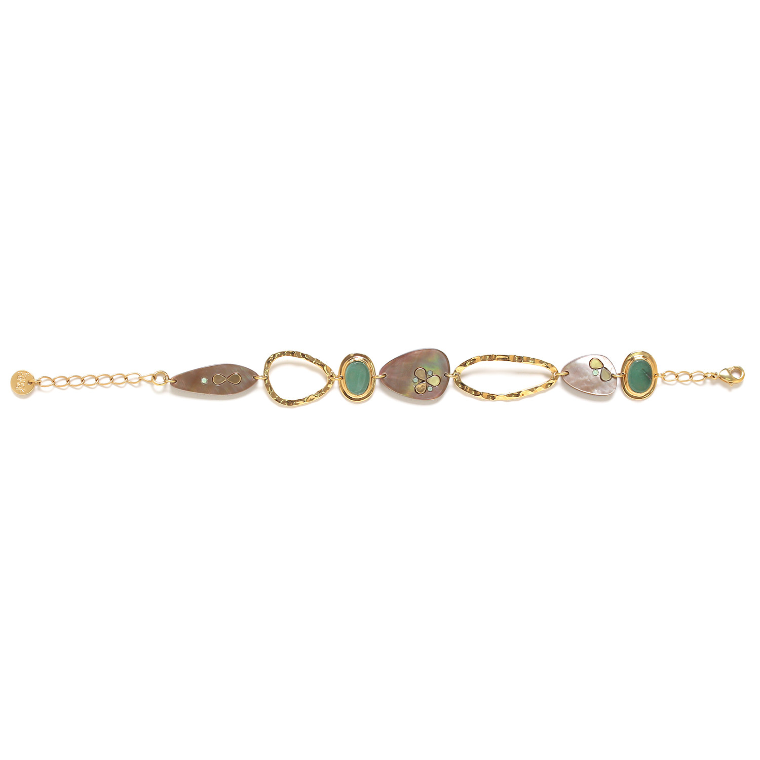 Composition : Aventurine Verte, Nacre Brune, Etain, Swarovski, Laiton doré à l’or fin 18K sans nickel et traité contre les allergies.