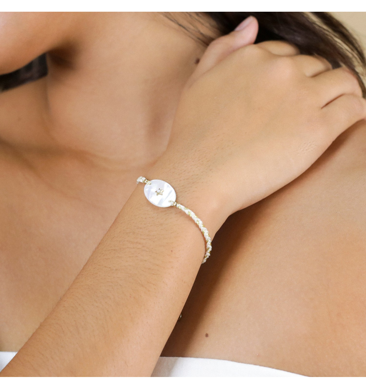 Bracelet Ajustable Nora signé FRANCK HERVAL. Le soleil, symbole de l’accomplissement personnel et le cœur, emblème universel de l’amour, sont au centre de cette collection. Sublimés par une touche de Nacre blanche, ces bijoux légers et délicats, finement travaillés feront à coup sûr de Nora une collection plébiscitée.