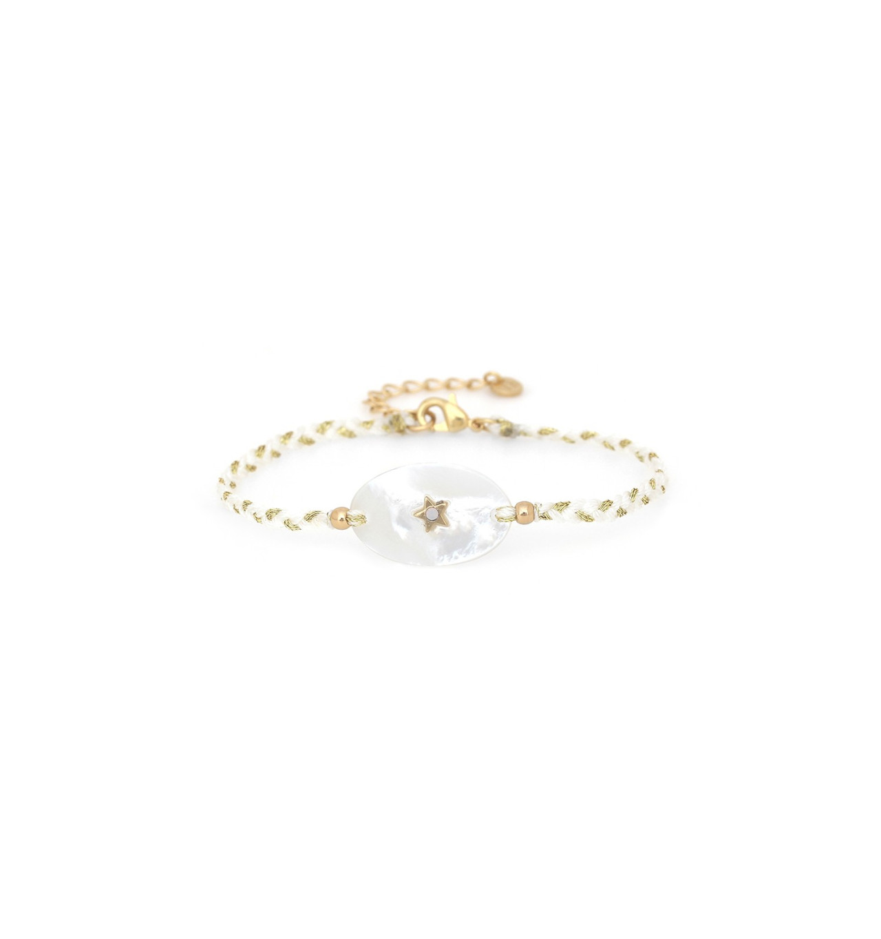 Composition : Nacre blanche, Swarovski, Laiton doré à l’or 18K sans nickel et traité contre les allergies.