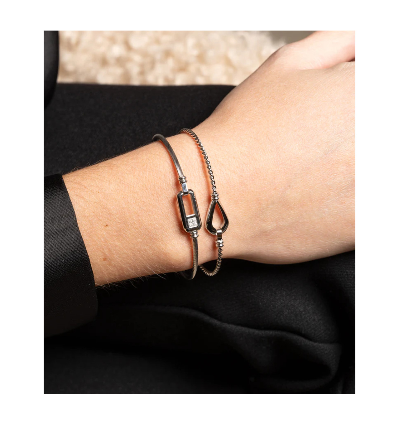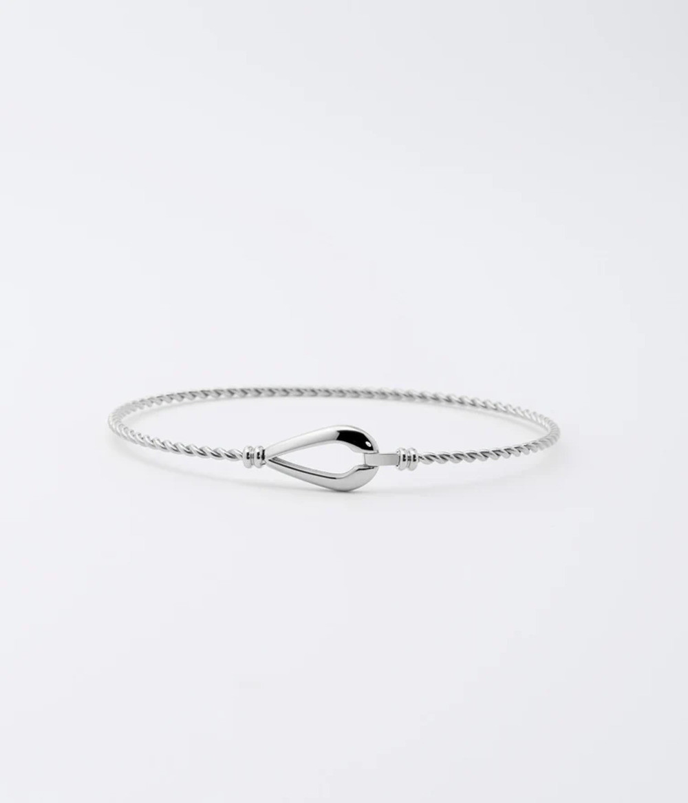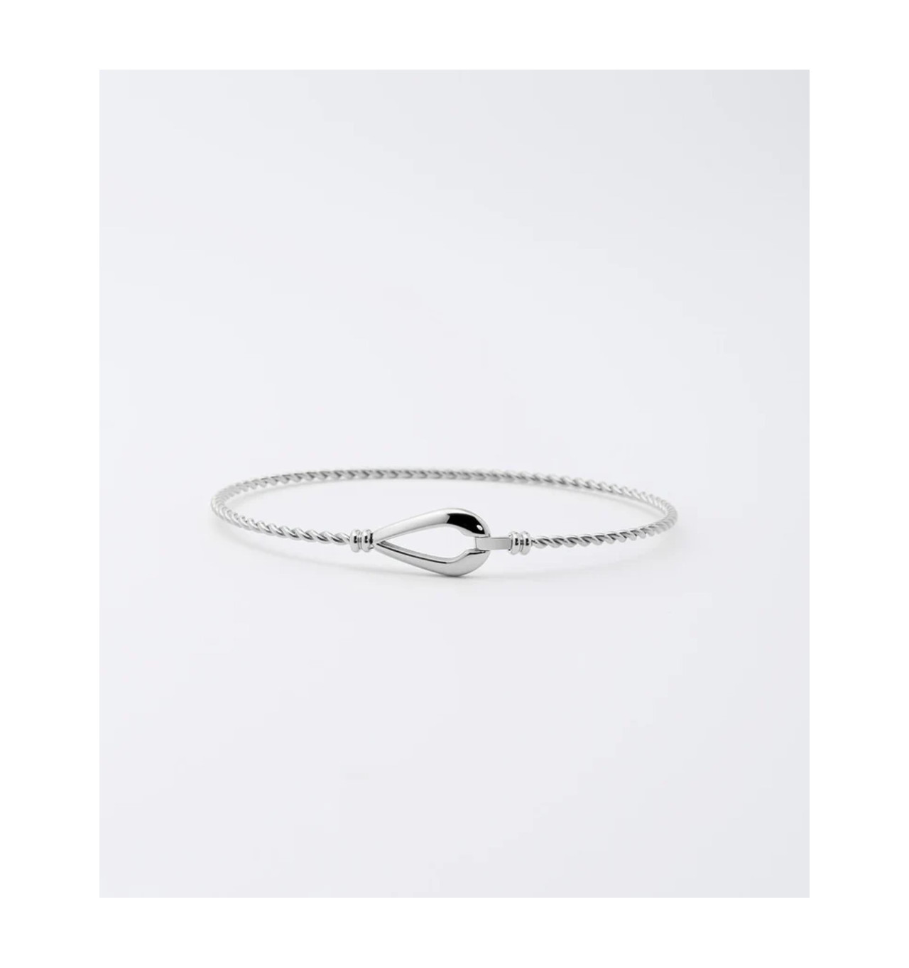 Bracelet Jonc Kendall signé ZAG Bijoux. Bracelet jonc torsadé en acier sur lequel est serti un empiècement en forme de goutte qui sert d'attache. La fermeture se fait avec un petit crochet qui permet de l'enfiler facilement.