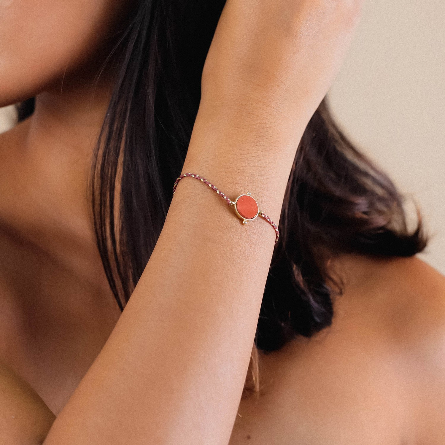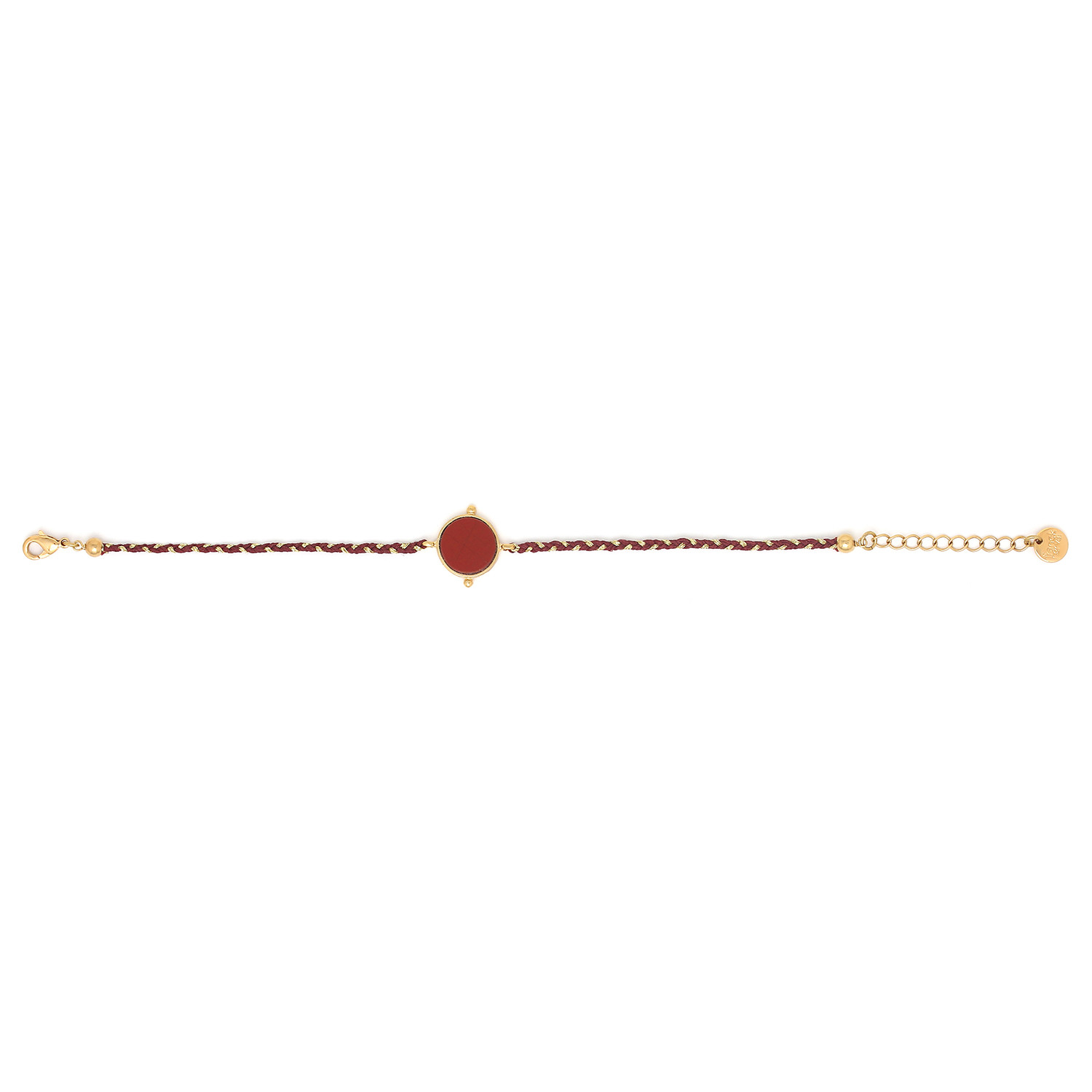 Composition de la ligne : Agate rouge, Nacre brune, Jaspe rouge, Laiton doré à l’or 18K sans nickel et traité contre les allergies.