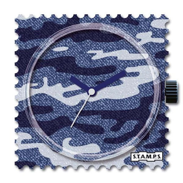 La montre STAMPS "Blue Army" représente un tissu en denim bleu orné d'un motif militaire frappant dans différentes nuances de bleu.