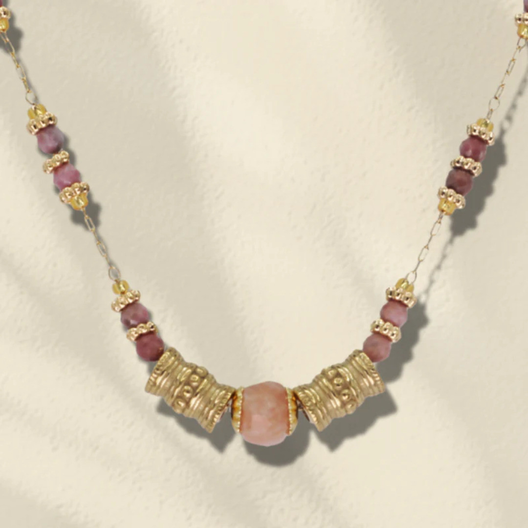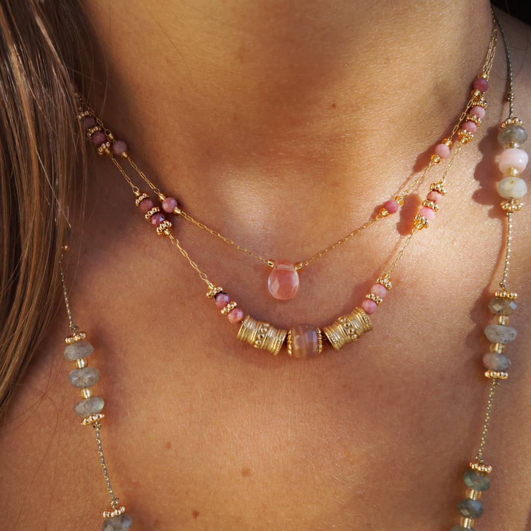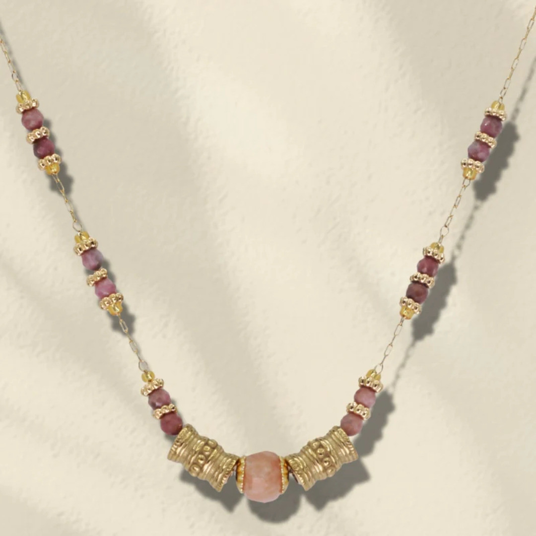 Collier Ethnica signé Loetma. Ce collier, délicatement suspendu à une fine chaîne en acier inoxydable, est orné d'une pierre centrale en Rhodochrosite. Les petites pierres naturelles ajoutent une touche de délicatesse et de douceur, tandis que les petites fleurs dorées et les pièces ethniques en acier inoxydable nous invitent dans un voyage au cœur de l'Inde.
