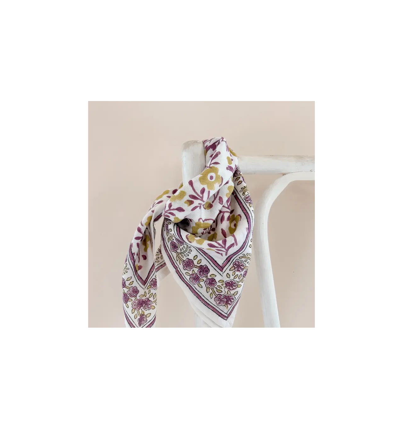 Ce foulard est confectionné artisanalement grâce à la technique indienne du block-print, les couleurs sont réalisées à partir de pigments naturels.