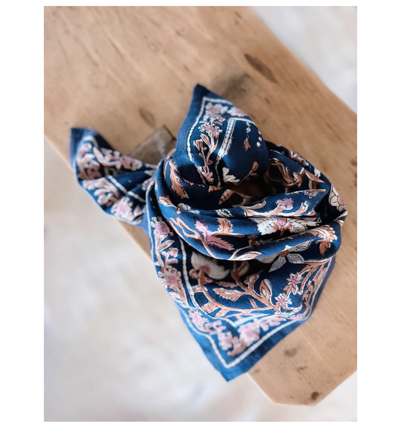 Ce foulard est confectionné artisanalement grâce à la technique indienne du block-print, les couleurs sont réalisées à partir de pigments naturels. Cette confection manuelle peut entraîner certaines irrégularités qui en font le charme en le rendant unique ♡