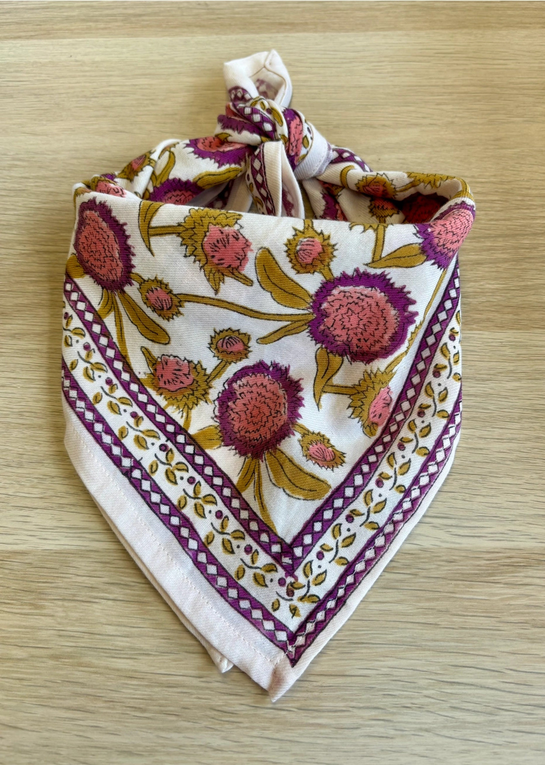 Ce foulard est confectionné artisanalement grâce à la technique indienne du block-print, les couleurs sont réalisées à partir de pigments naturels. Cette confection manuelle peut entraîner certaines irrégularités qui en font le charme en le rendant unique ♡