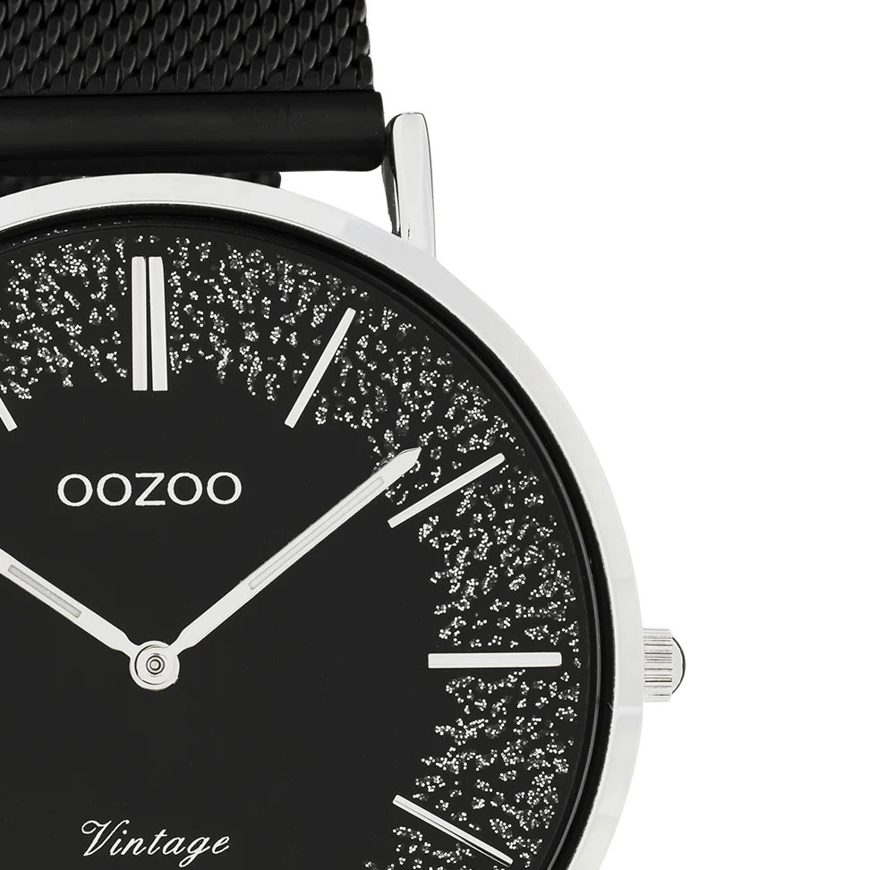 Montre femme ronde signée OOZOO. Ce modèle C20140 d'OOZOO Vintage rond est incontestablement l’accessoire incontournable pour cette saison! Cette montre femmes est aussi bien sophistiquée que confortable à porter grâce à son boitier rond en métal couleur argent de 4 cm et son cadran noir avec des scintillements. Le bracelet en Mesh noir fait de cette montre un accessoire tendance à porter au quotidien! Cette montre ajoutera indéniablement de l'éclat à votre tenue. Le verre minéral repose dans un boîtier métallique de 6,9 mm mince en placage IP. Ce design est muni d’un support en acier inoxydable et dépourvu de nickel. Cette montre possède un mouvement japonais 2.